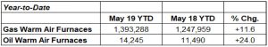 U.S. shipments of gas warm air furnaces for May 2019 increased 4.6 percent, to 290,143 units, up from 277,258 units shipped in May 2018. Oil warm air furnace shipments increased 39 percent, to 2,703 units in May 2019, up from 1,944 units shipped in May 2018.