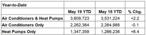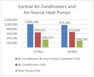 U.S. shipments of central air conditioners and air-source heat pumps totaled 1,005,646 units in May 2019, up 3.5 percent from 971,246 units shipped in May 2018. U.S. shipments of air conditioners decreased 2 percent, to 659,423 units, down from 673,010 units shipped in May 2018. U.S. shipments of air-source heat pumps increased 16.1 percent, to 346,223 units, up from 298,236 units shipped in May 2018.