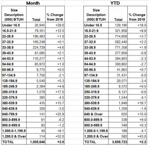 Year-to-date U.S. shipments of gas warm air furnaces increased 11.6 percent, to 1,393,288 units, compared with 1,247,959 units shipped during the same period in 2018. Year-to-date U.S. shipments of oil warm air furnaces increased 24 percent, to 14,245 units, compared with 11,490 units shipped during the same period in 2018.